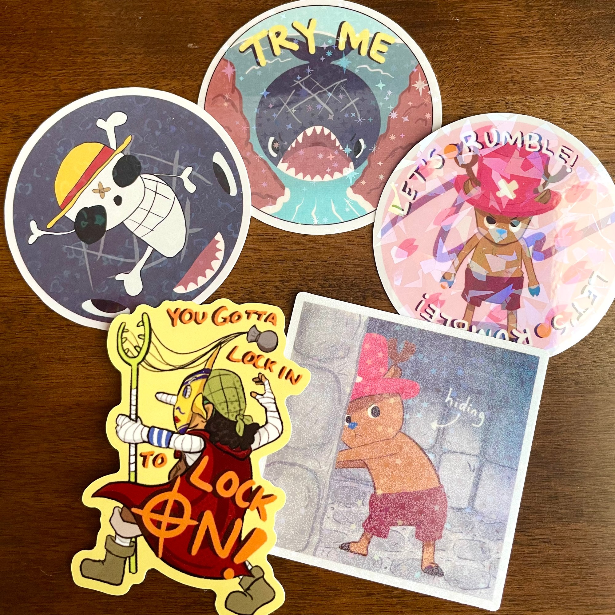 Various vinyl + holographic stickers of your favorite reindeer, whale, and Sniper King.